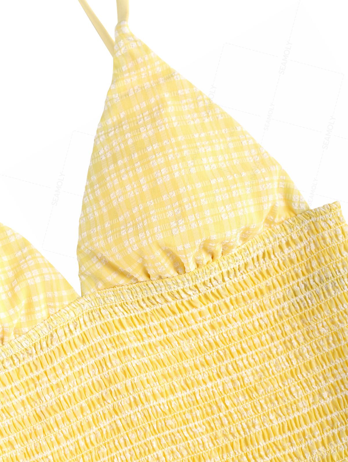 Oriental Plaid Textured Smocked Ruffles Plunging Neck Tankini Set